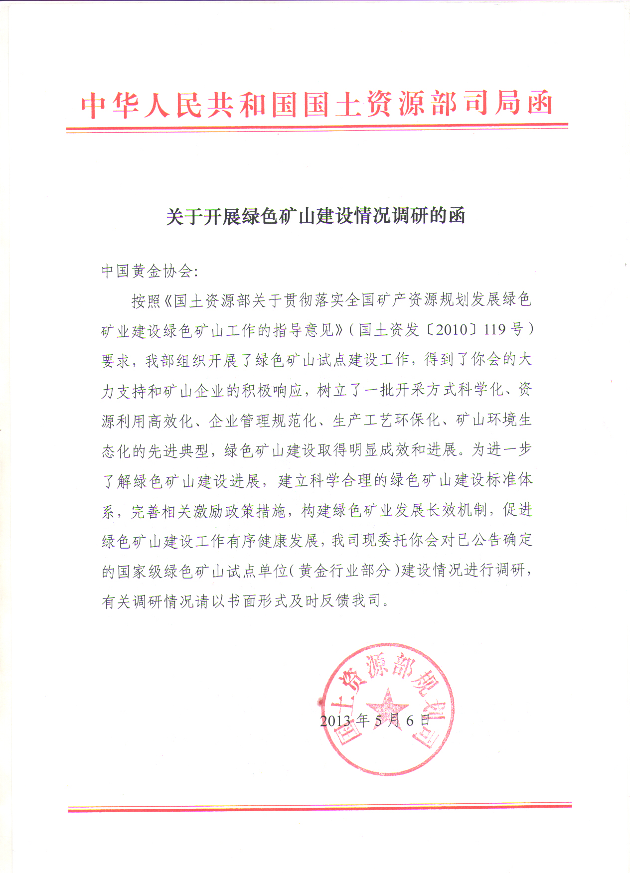 为深入贯彻落实党的十八大“大力推进生态文明建设”的精神,以及《国土资源部关于贯彻落实全国矿产资源规划发展绿色矿业建设绿色矿山工作的指导意见》(国土资发〔2010〕119号)要求,受国土资源部规划司委托(详见附件1),中国黄金协会将开展黄金行业国家级绿色矿山试点单位建设情况调查工作。现将有关事项通知如下: